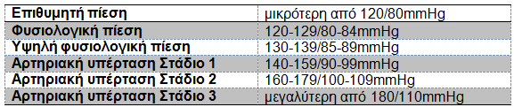 Τα όρια της αρτηριακής πίεσης, όπως αυτά έχουν καθοριστεί από την επιστημονική κοινότητα, φαίνονται στον πίνακα (ο πρώτος αριθμός αφορά στη μεγάλη-συστολική πίεση και ο δεύτερος στη μικρή-διαστολική πίεση):