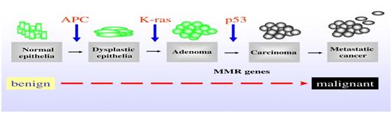 Φυσιολογικό επιθήλιο- υπερπλαστικό επιθήλιο- πρώιμο αδένωμα (πολύποδας με χαμηλόβαθμη δυσπλασία)- προχωρημένο αδένωμα (πολύποδας με υψηλόβαθμη δυσπλασία)- διηθητικός καρκίνος- μεταστατικός καρκίνος