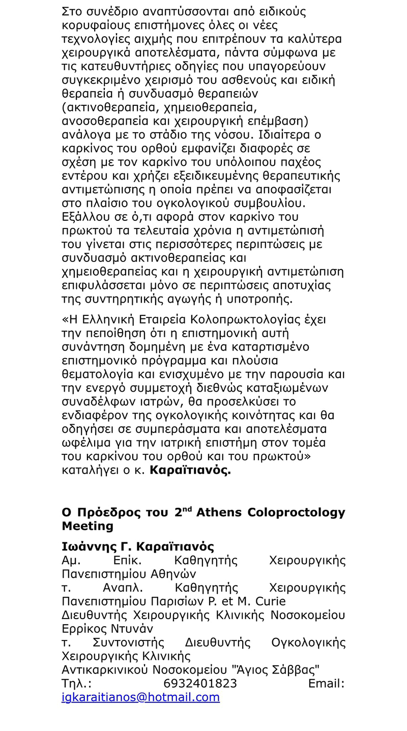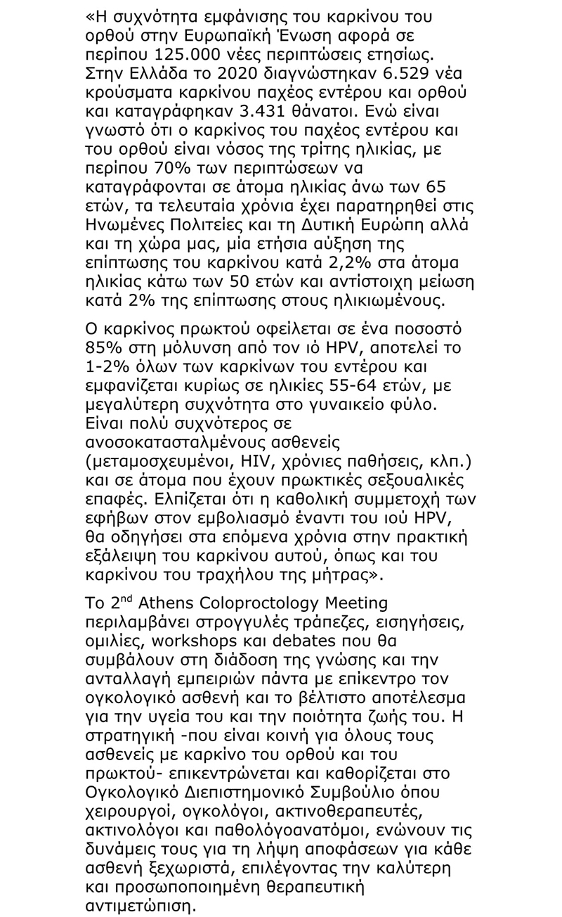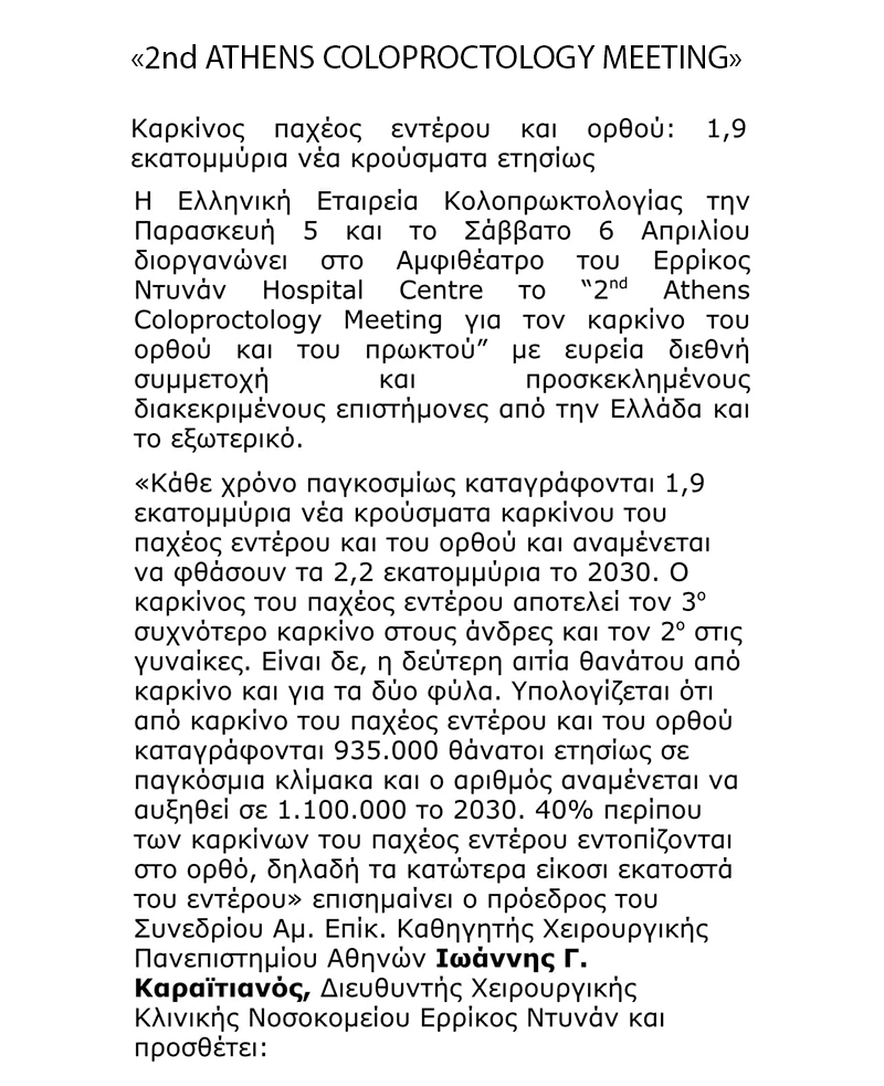 H Ελληνική Εταιρεία Κολοπρωκτολογίας την Παρασκευή 5 και το Σάββατο 6 Απριλίου διοργανώνει στο Αμφιθεάτρο του Ερρίκος Ντυνάν Hospital Centre το «2nd Athens Coloproctology Meeting για τον καρκίνο του ορθού και του πρωκτού»