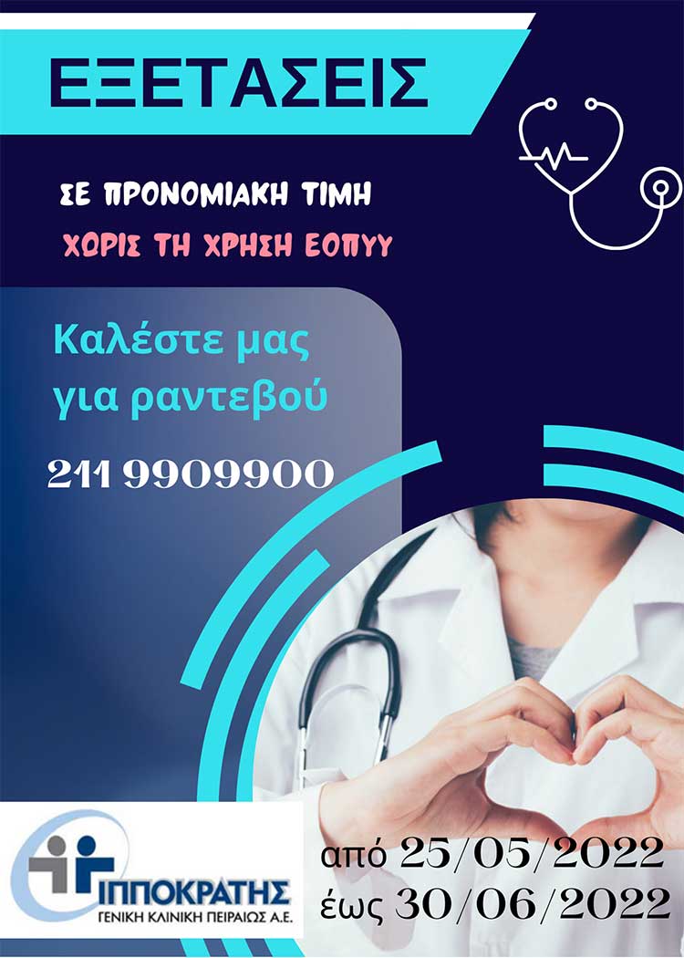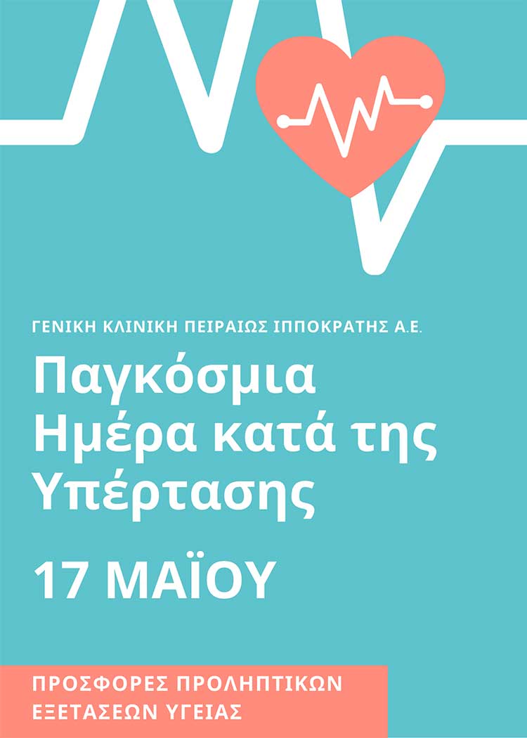 Εξετάσεις προληπτικού καρδιολογικού ελέγχου σε μειωμένη προνομιακή τιμή, χωρίς τη χρήση ΕΟΠΥΥ, προσφέρει η Γενική Κλινική Πειραιώς ΙΠΠΟΚΡΑΤΗΣ Α.Ε., από τις 25 Μαΐου έως τις 30 Ιουνίου, με αφορμή την Παγκόσμια Ημέρα κατά της Υπέρτασης.