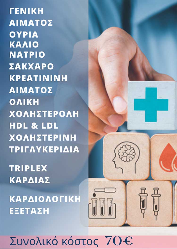 Αιματολογικό έλεγχο(Γενική Αίματος, Ουρία, Κάλιο, Νάτριο, Σάκχαρο, Κρεατινίνη Αίματος, Ολική Χοληστερόλη, HDL & LDL Χοληστερίνη, Τριγλυκερίδια), Triplex Καρδιάς, Καρδιολογική εξέταση